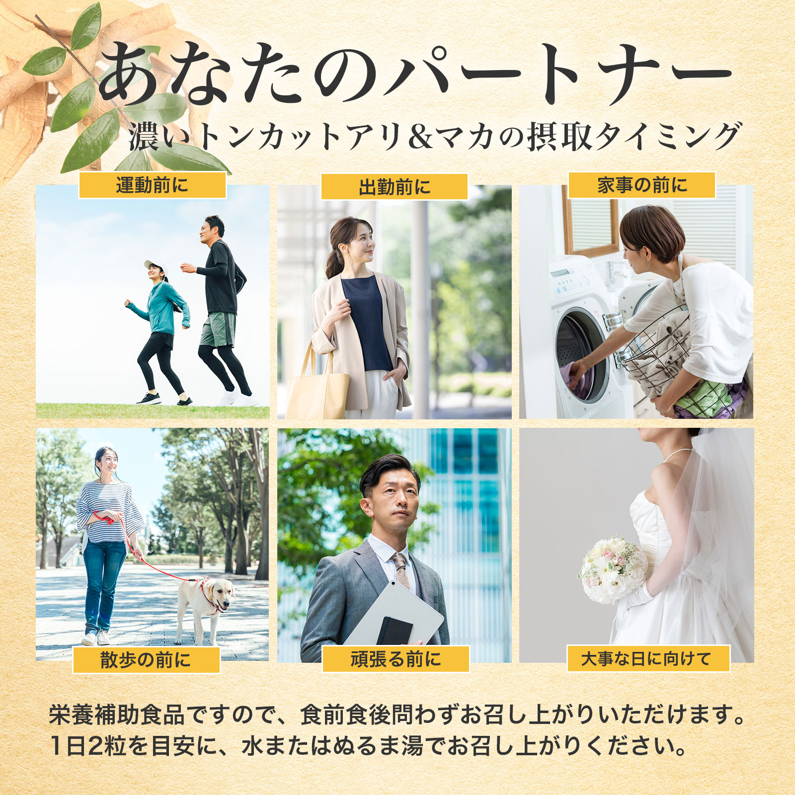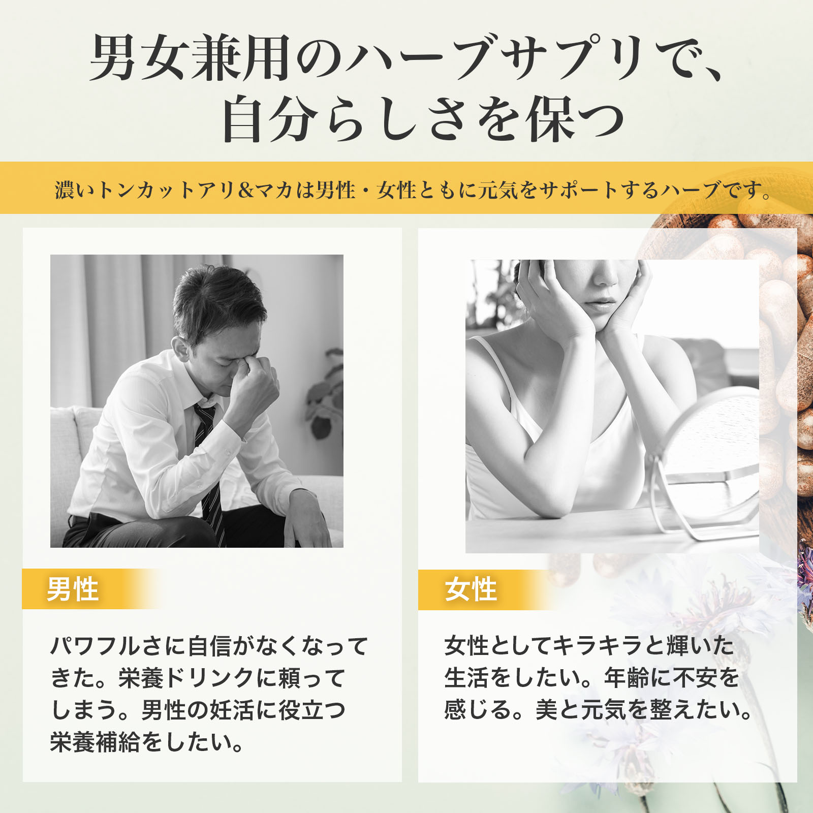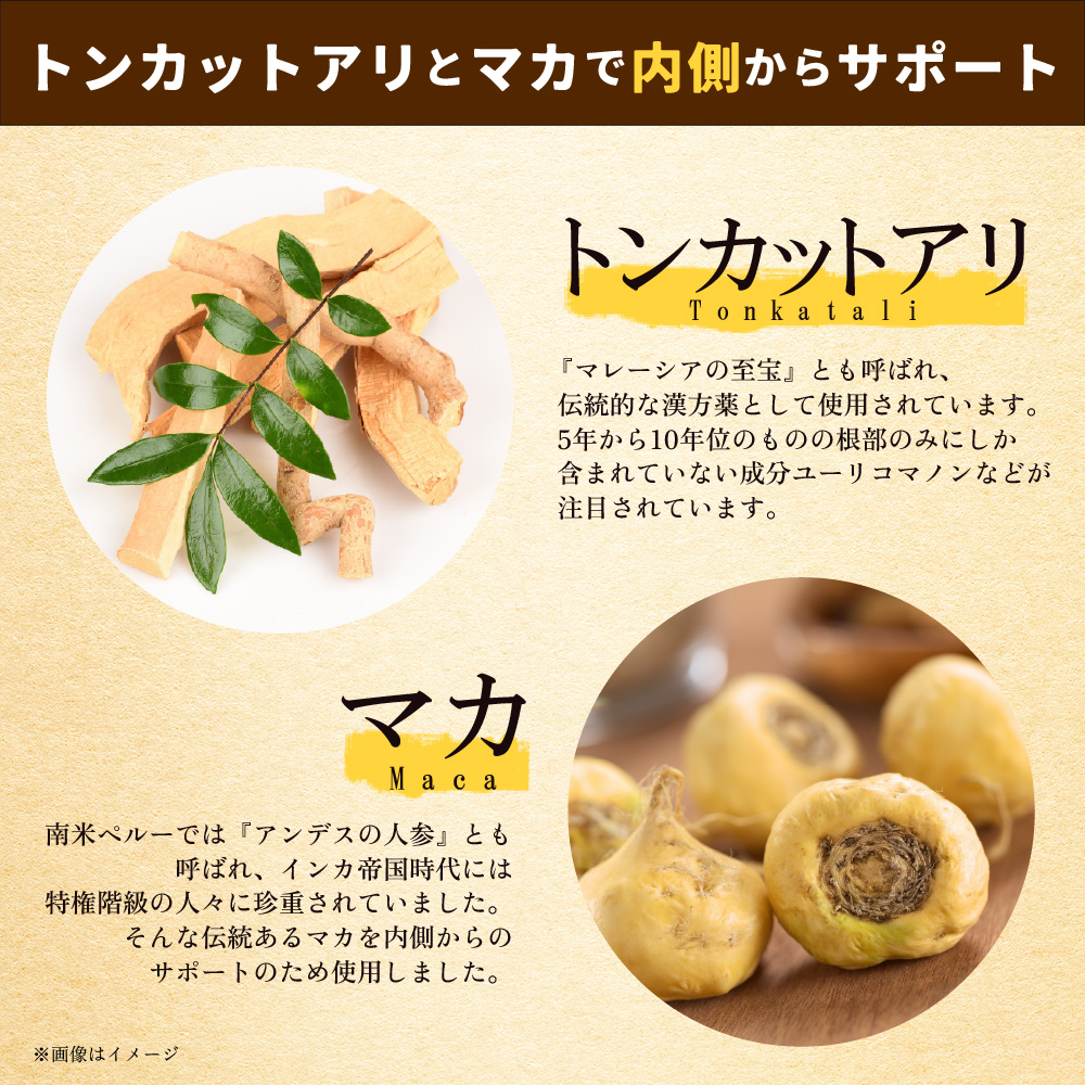 健康補助食品として知られるトンカットアリとマカをバランスよく配合し、食生活のサポートを目的としています。