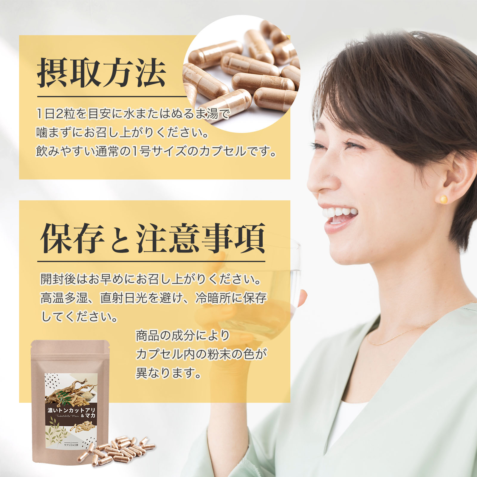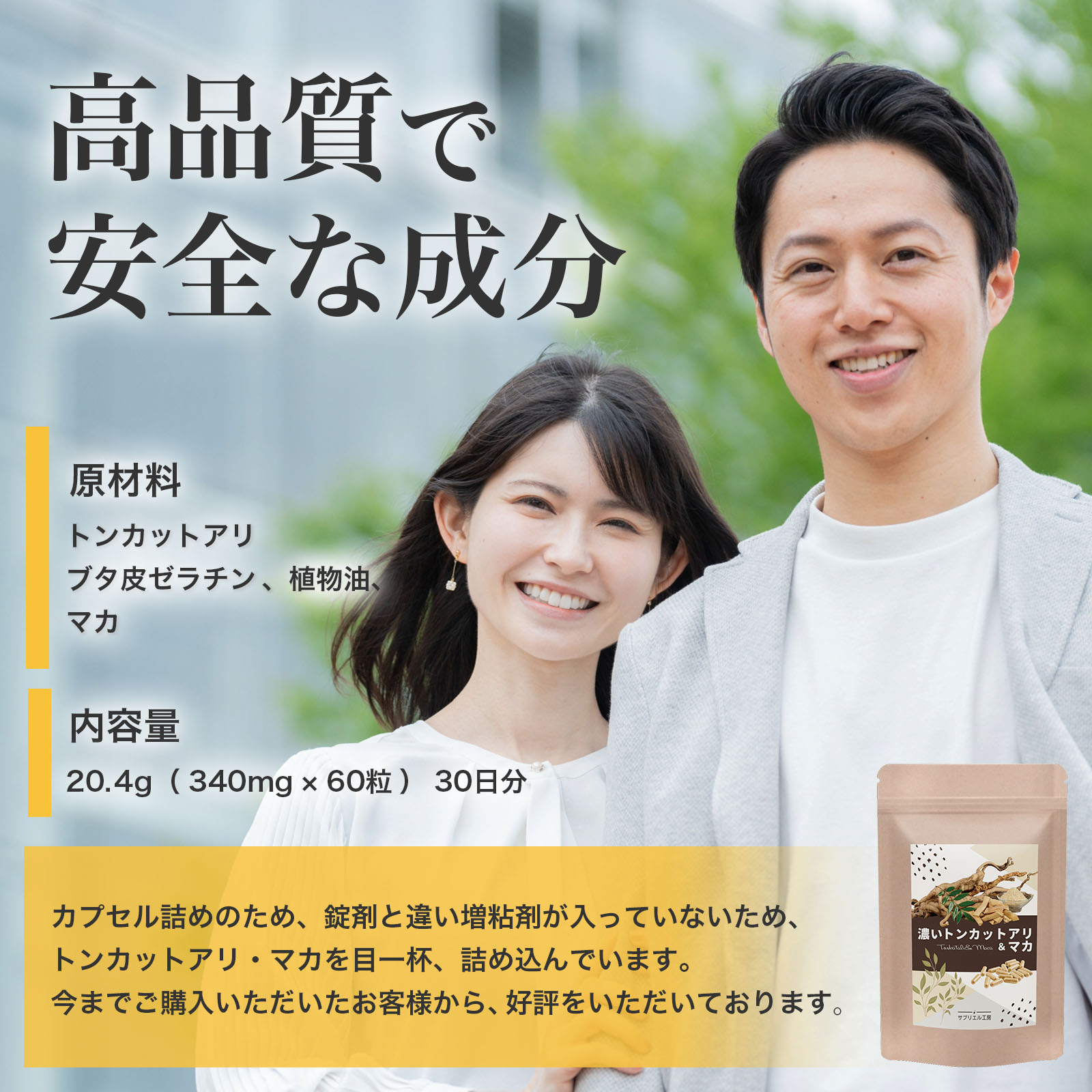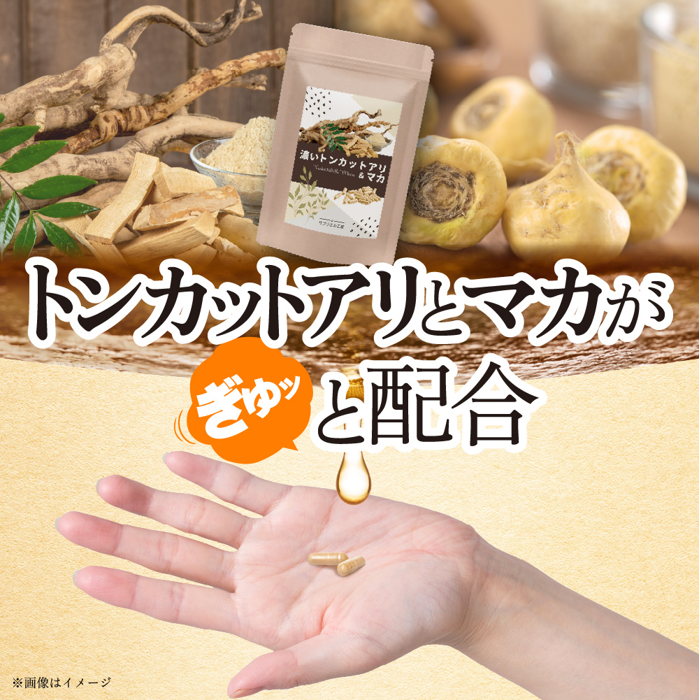 健康補助食品として知られるトンカットアリとマカをバランスよく配合し、食生活のサポートを目的としています。